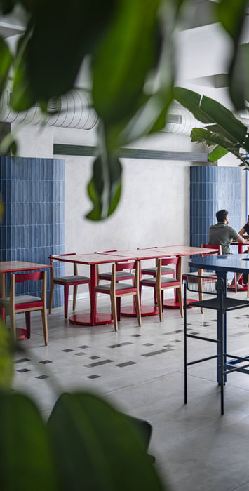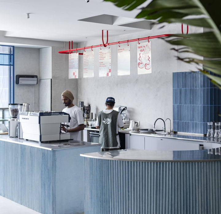Upon entry, a striking blue counter emerges as the central mass—its sculptural volume arresting, almost monolithic. It is here that the design's colour language first comes into focus: a vivid red menu board sits directly behind the counter, not as an afterthought but as a deliberate counterpoint. Together, the blue and red form a kind of spatial diptych—bold yet balanced, primary yet far from simplistic. This pairing sets the tone for the café’s chromatic logic: colour is not decoration, but structure.